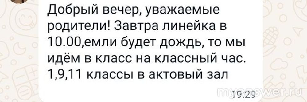 У нас в Хакасии линейку на улице могут отменить по причине плохой погоды, если на улице будет дождь, то линейка пройдет в актовом зале школы для 1,9,11 классов. Для остальных школьников будет классный час.