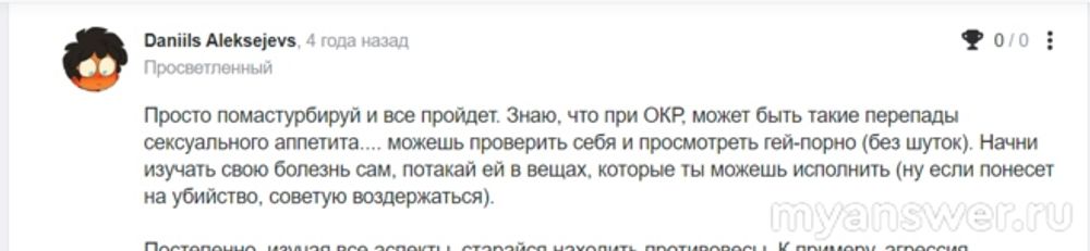 Читал информацию про ОКР и ГОМО-ОКР и наткнулся на вот такой ответ на сате Ответы Мэйл.Ру. Там парень жаловался на ОКР и ГОМО-ОКР(могу ссылку дать на этот вопрос с ответом) и одни из пользователей ответил ему таким вот образом. ОКР-это обсессивно-компульсивное расстройство, если что. Граничит с неврозом. А ГОМО-ОКР соответственно-гомосексуальное обсессивно-компульсивное расстройство, то есть гомосексуальные, навязчивые мысли, вызывающие тревогу и панику.