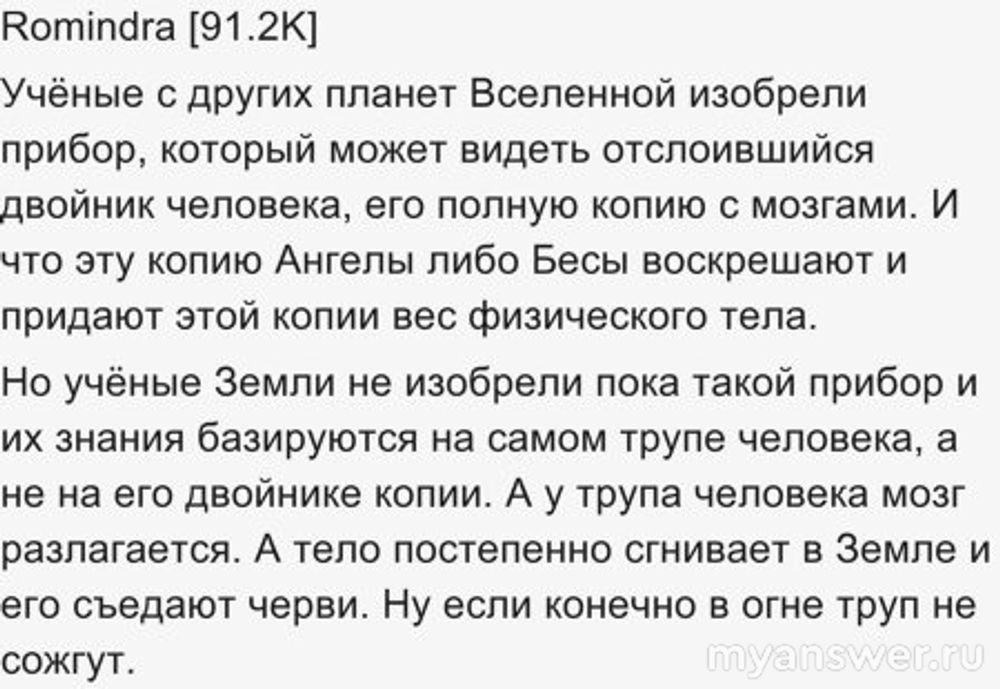 Кроме того, каждый человек состоит из конкретного набора молекул - воскрешение подразумевает работоспособный набор именно этих молекул, а не ту кашу которая остается после (опять цитата из комента Romindra )