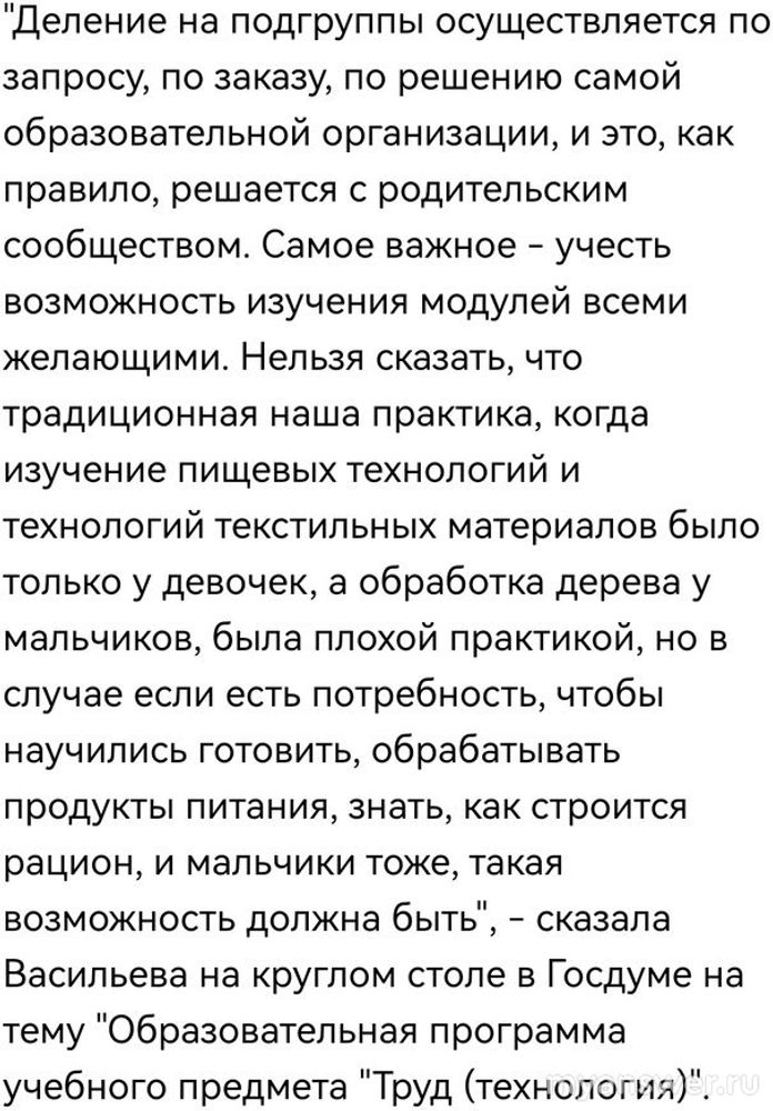 Как многие уже знают, в школах с началом этого учебного года вернули урок Труда, технологию. Но сделали этот урок модульным, то есть прописали что должно быть обязательно в этой дисциплине. Также законодательно объявили что форма проведения урока должна решаться с родителями, то есть захочет мальчик узнать технологию производства кулинарных блюд, то может посещать эти занятия. В этом состоит большой вопрос должно ли быть разделение на подгруппы для изучения разных предметов или это будет разделение по гендерному принципу. Как стало известно от Минпросвещения механика урока Труд отдается на усмотрение образовательных организаций, если родители не будут против, то урок технологии будет проводится отдельно для мальчиков и девочек, если примут решение за совместное ведение, то без разделения на подгруппы.