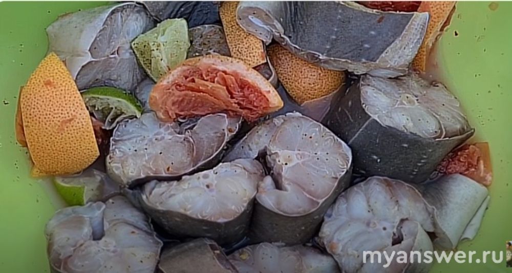 .Солим и перчим куски рыбы. Выжатым соком лайма и грейпика заливаем в мисочке и оставляем на час. Потом переворачиваем кусочки и пусть насыщается маринадом еще час. Всего 2 часа.