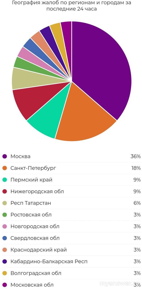 Пик сбоев приходится на Москву, Санкт-Петербург, Пермский край, Нижегородскую область, республику Татарстан.