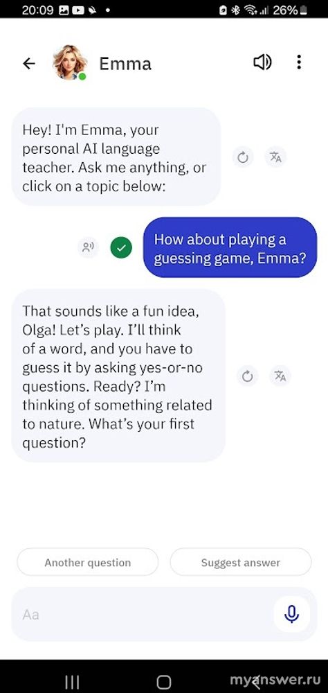 На телефоне стоит приложение Talkpal (что примерно можно перевести как "собеседник"), и с ним можно вполне говорить. Разговариваю я с Эммой. Она проговаривает свои фразы голосом и пишет текстом. Я только говорю, мой текст Эмма распознает и отвечает. Получается вполне связный диалог.