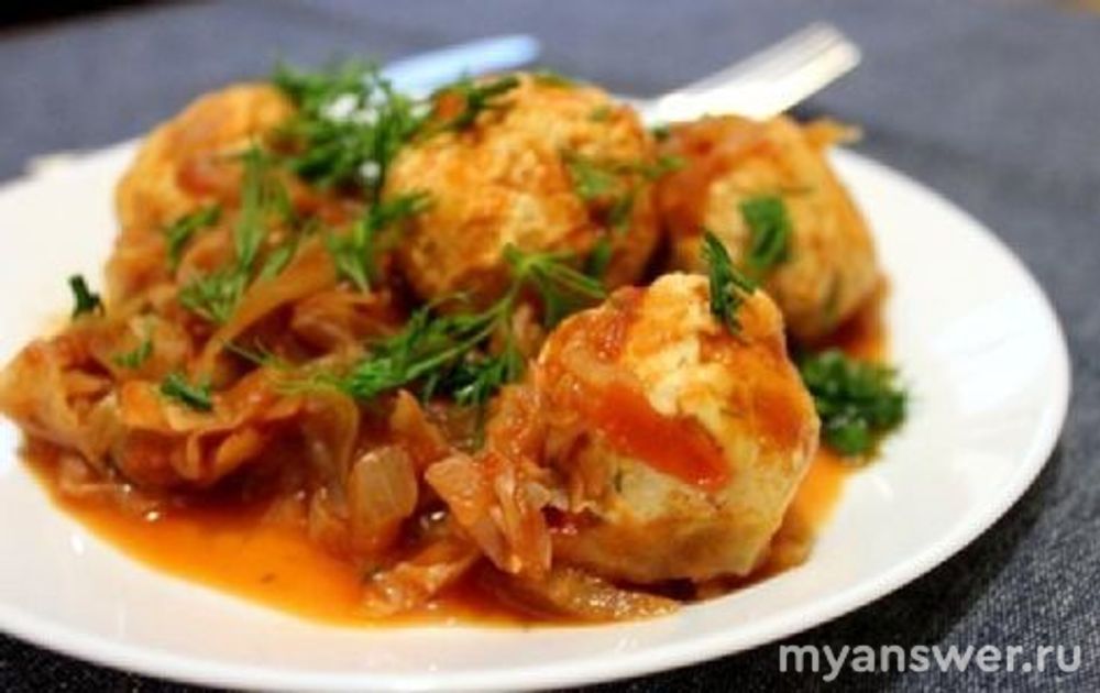 Муку смешать с посыпкой и петрушкой, добавить соус и лимоннй сок, добавить дозы и довести до кипения, затем полить фрикадельки и капусту этой смесью.