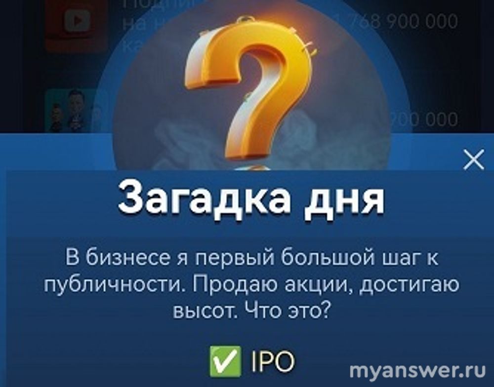 Сегодняшняя загадка очень проста, так как одержит в себе определение, под которым происходит рабочий процесс - ценные бумаги или акции впервые размещаемые на бирже, привлекают к себе внимание неограниченного количества инвесторов. Таким образом компании получают публичность. В этом большие плюсы для новых компаний, так как инвесторы пока не знают их перспективы доходности, это будет известно не раньше чем через полгода деятельности компании, когда будет ясна успешность их бизнеса в будущем. Пока же существует вероятность роста акций, этот процесс выгоден обоим: компания получает прибыль и может выплачивать дивиденты, а инвесторы тоже получают доход. В Загадке Дня сегодня аббревиатура от английского