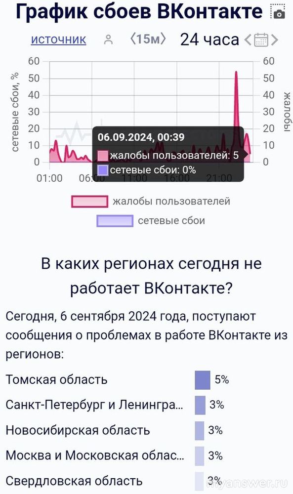 В ночь на пятницу, 6 сентября 2024 года, продолжились существенные технические проблемы в социальной сети "ВКонтакте", возникшие там ещё накануне вечером. В частности, в настоящее время массовые сообщения о приличном техническом сбое на рабочих серверах в данной социальной сети приходят от еë пользователей из Томской и Новосибирской областей, а также из столичного региона Российской Федерации. Технические специалисты из "ВКонтакте" сейчас занимаются поиском и устранением данных технических неполадок.