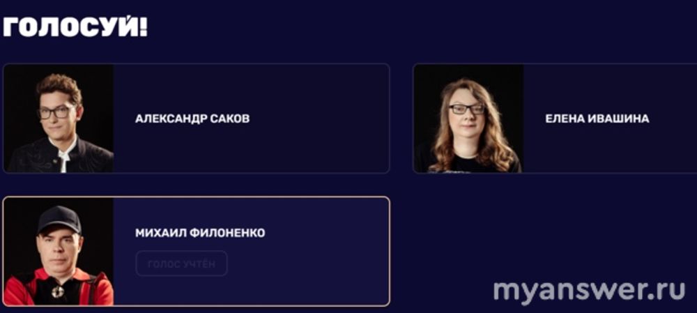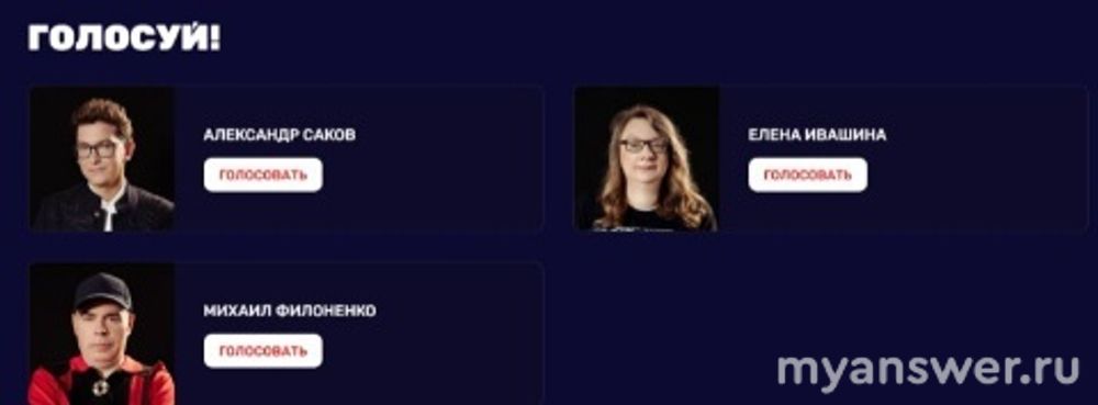 За лучшего участника, с вашей точки зрения, можно голосовать после каждого выпуска, за любого из тройки, даже за того, кто в этом выпуске проиграл и выбыл из дальнейшей борьбы. Только нужно помнить, что за одного человека вы можете отдать свой голос только один раз за сезон (думаю, что это придумано, чтобы избежать накруток).