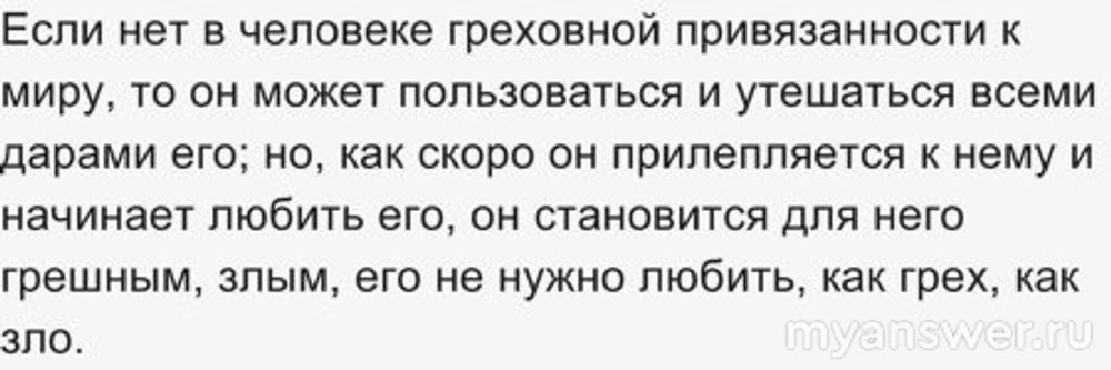 "Человек должен любить Бога всею душою своею, а мир, как греховный - во зле, и потому человек не должен любить его; человек, таким образом, стоит между ними и должен выбирать между ними, или любовь к Богу, или любовь к миру, должен служить или Богу, или мамоне (Мф. 6:24 прим.); Бог и мир стали для человека как противоположность, так что дружба с миром есть вражда против Бога, и, кто хочет быть другом миру, тот становится врагом Богу (Иак. 4:4 ср. прим.). Таким образом, если нет в человеке греховной привязанности к миру, то он может пользоваться и утешаться всеми дарами его; но, как скоро он прилепляется к нему и начинает любить его, он становится для него грешным, злым, его не нужно любить, как грех, как зло. То же самое относится и ко всему, что есть в мире, и ко всем предметам мира, и ко всем людям, и ко всем животным, и вообще ко всем тварям: кто любит что-либо или кого-либо более, чем Бога, тот недостоин Бога и любви Его..." (ср. Мф. 10:37 и прим.)