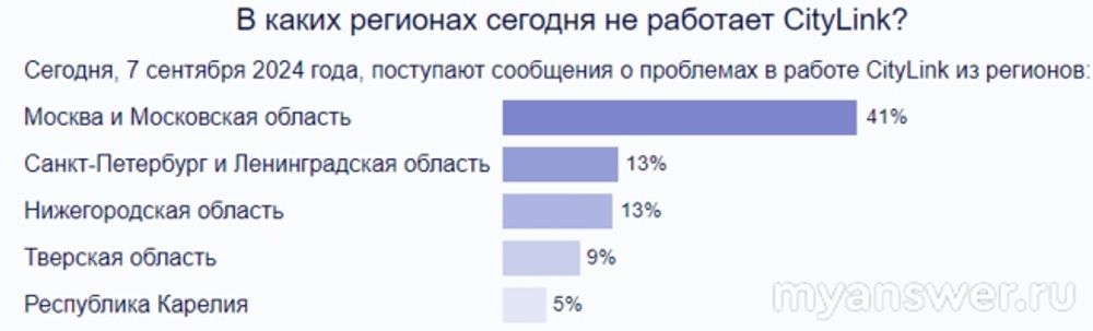 СитиЛинк является известным провайдером, предоставляющим услуги домашнего интернета и еще кабельного телевидения. Седьмого сентября в его работе наблюдаются сбои. Люди говорят, что сбит домашний интернет, на сайт не получается зайти, либо в личный кабинет попасть. Больше всего жалоб было в шестнадцать часов пятнадцать минут по Москве, когда о неполадках рассказали тридцать четыре человека. География жалоб от Московской области, до Республики Карелии: