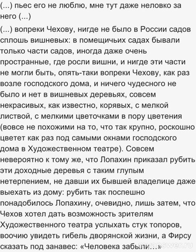 Мне даже как-то неловко за Бунина становится, когда я вижу, как он не заметил, сколько времени прошло между продажей имения и рубкой сада; также тем бросающимся в глаза фактом, что если этим людям (персонажам) не помочь каким-нибудь волшебным пенделем, то они ещё год сидели бы в этом пустом доме и собирались бы "вот-вот" уехать. Вся пьеса — примерно об этом. Но дело даже не в этом. Журналист А. Минкин (объявленный в 2024 г. иноагентом, а во времена своего исследования им не бывший), умевший в 90-е находить недвижимость у Гайдара (не Аркадия, а Егора), сумел найти документальное подтверждение о реальных российских имения, обладавших именно такими вишнёвыми садами, как показано у Чехова. Но это лишь штришок к портрету "экспертного мнения" Бунина.
