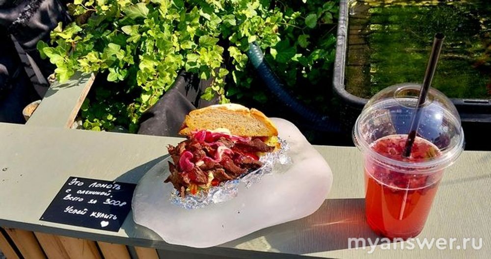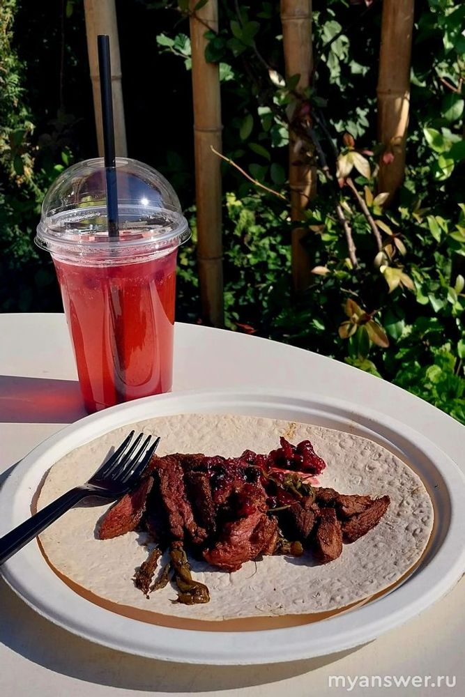 Блюдо подаётся на пшеничной лепешке. Оленина очень вкусная, папоротник немного пересолен на мой вкус, но все вместе оригинально. Так как на улице очень жарко рекомендую взять охлаждающий морс из таежных ягод. Стоимость 250 рублей.