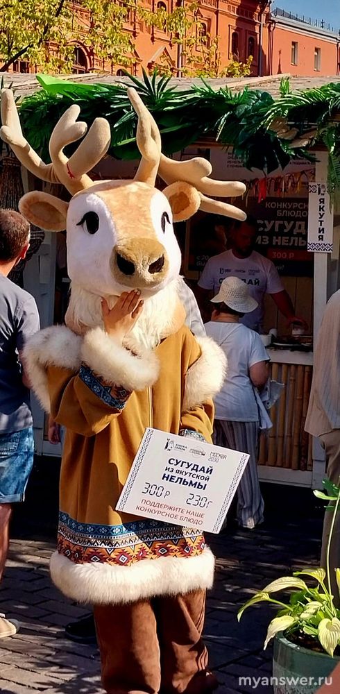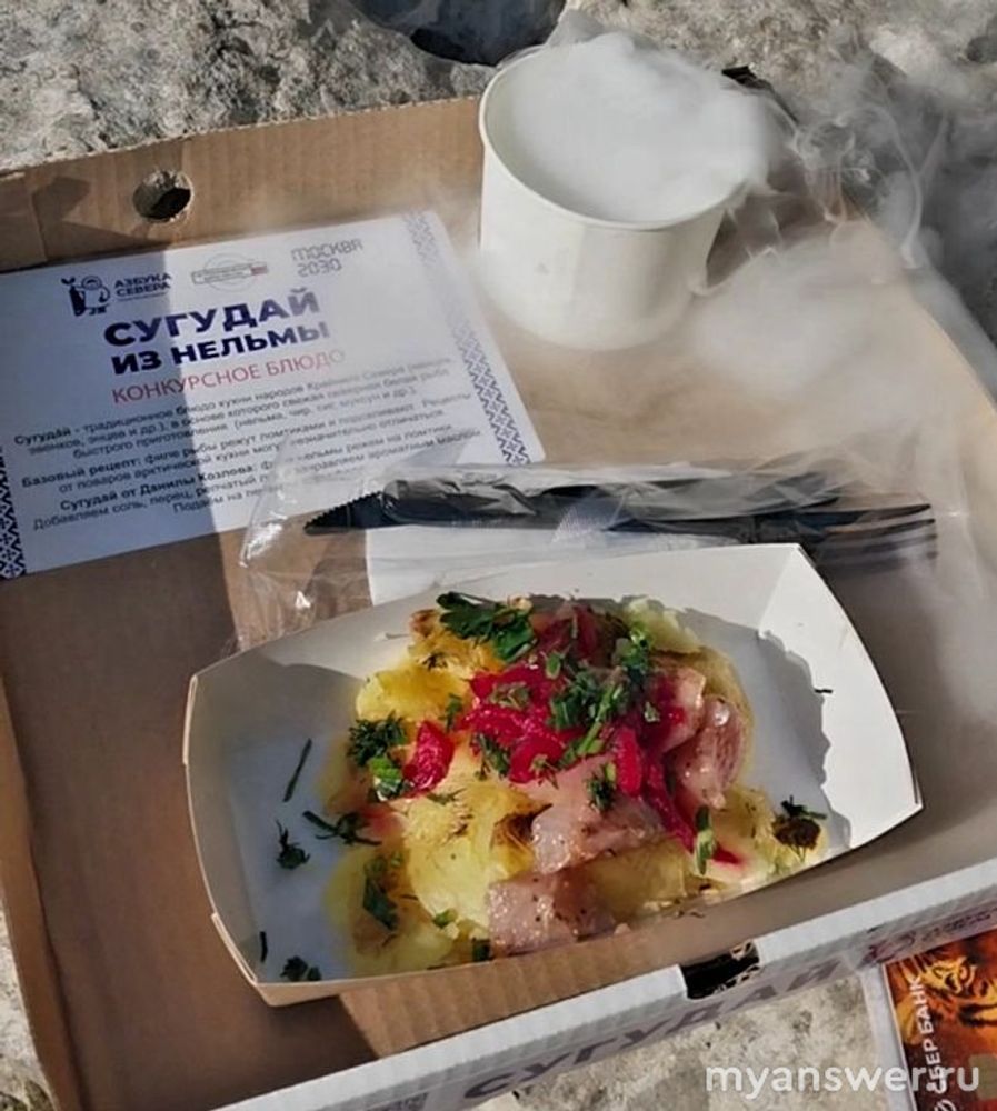 Якутское блюдо сугудай (переводится "ешь сырым") представлено очень необычно, к рыбке (нельма) на подушке из печеного картофеля подают стаканчик, из которого валом идет пар. Создается ощущение, что на улице мороз, хотя жарит солнце: