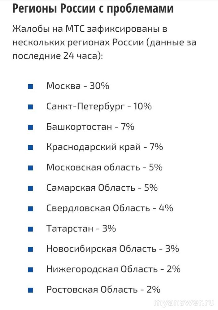 9 сентября 2024 года примерно с 8 утра по московскому времени плохо стал работать МТС интернет и мобильная связь в некоторых российских регионах. На данный момент проверочный сервис мониторинга сетей в интернете показывает статус МТС как - "Текущее состояние сервиса проблемы". Сетевые сбои идут в основном в таких регионах как Санкт-Петербург и Ленинградская область, Камчатский край, в Республике Татарстан, в Москве и московской области, Твери. Это общий сетевой сбой - 97% как показывает мониторинг, в том числе и продолжаются поступать жалобы от пользователей до-сих-пор на это время - 15 часов дня по московскому.