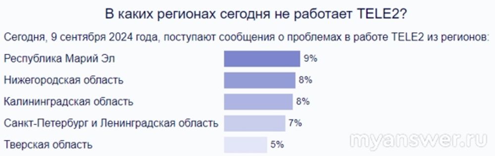 Абоненты данного мобильного оператора девятого сентября отмечают его некорректную работу. Люди из различных областей и краев России сообщают, что не могут дозвониться, не слышат собеседника, у кого-то, вообще, отсутствует связь. Еще проблемы с мобильным интернетом наблюдаются. Скорее всего дело в каком-то техническом сбое. Может авария случилась у оператора связи, неблагоприятные погодные условия, к примеру, ветер сильный, либо гроза. Может и перегрузка сервера. В одиннадцать пятнадцать по Москве пожаловались тринадцать человек, и каждый час примерно семь-десять человек жалуются. География жалоб такая: