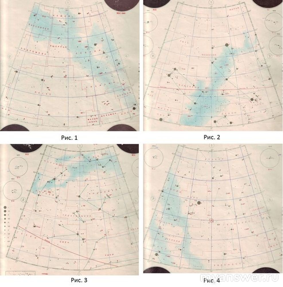 Но на самом деле, помимо упомянутых десяти созвездий Млечный Путь проходит еще по семи созвездиям. Чтобы не быть голословным привожу сканы из Атласа звездного неба. В нем (в Атласе) голубоватой полосой изображен Млечный Путь. Млечный Путь проходит еще по следующим созвездиям: