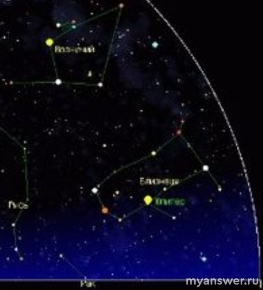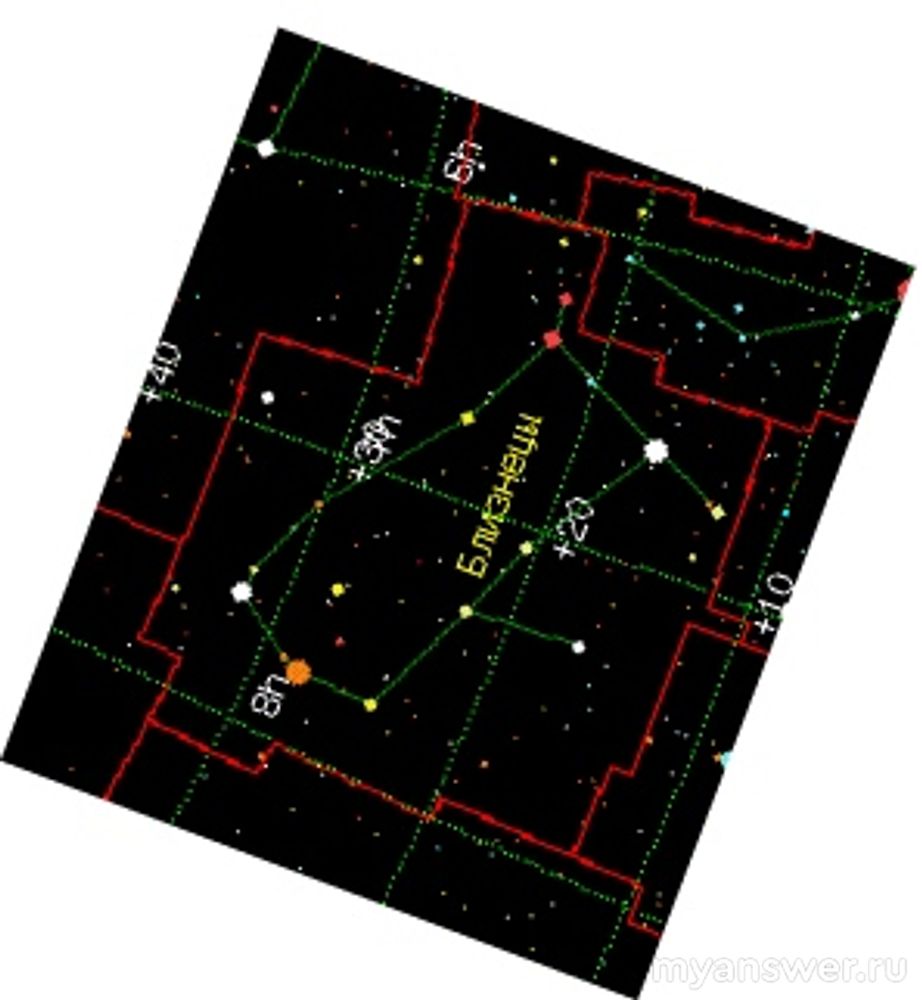 Судя по положению звезд, соединённых в неправильный прямоугольник, и трём отходящим от него веткам, это одно из зодиакальных созвездий, носящее название Близнецы.