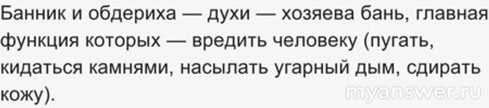 Баня- это радость, баня- это польза, баня - это расслабление и отдых. Но не все так лучезарно. Баню надо уметь правильно натопить без угара, париться надо в меру, по силам чтобы не стало плохо от перегрева. Веник надо хорошо изготовить, запарить, чтобы следов от веток не осталось. Проще всего собственную неумелость, просчеты списать на козни мифических существ. Дескать, это не я, а зловредный банный дух постарался. Живет этот банный дух за каменкой , под полком. Являлся голой бабой с длинными волосами. А может это были сексуальные видения отдохнувшего, расслабленного тела? Ответ на вопрос кроссворда - обдериха. Слово из 8 букв.