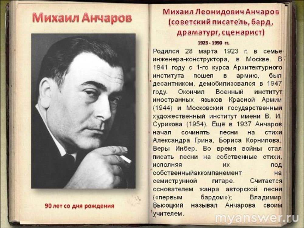 Вопрос меня немного удивил, потому что я ранее не встречался с упомянутым произведением. Знакомясь с темой, выяснилось что этого человека - писателя в Союзе считали первым бардом, это Михаил Анчаров.
