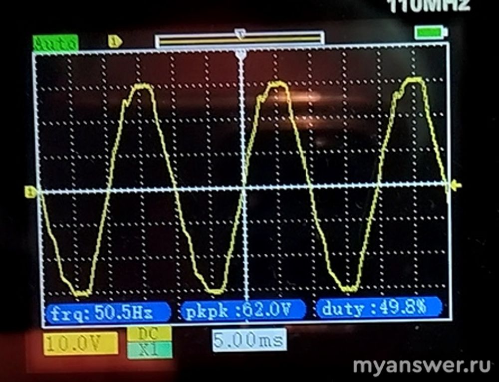 PS В Сети идёт дискуссия о том, что любые двигатели не любят "нечистую синусоиду" (в том числе и холодильники) - мол, это плохо для компрессоров. Но в наших сетях никаких идеальных синусоид особо и не бывало. Вот примерно так оно выглядит в розетке