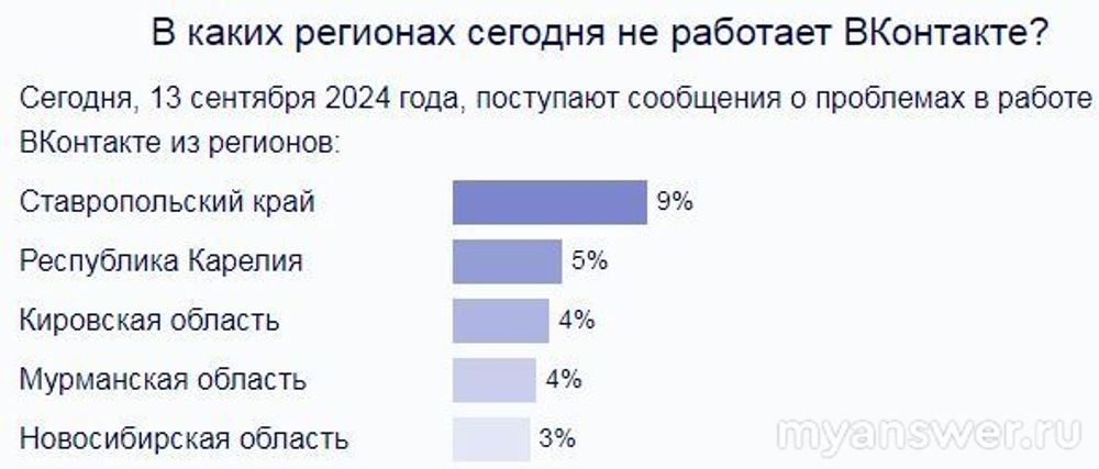Целый день показывается небольшой сбой Вконтакте, к вечеру он увеличился. 13 сентября больше всего жалоб из Карелии и Ставропольского края. Жалуются и на мобильное приложение и на сайты в компьютерах.Если у вас к своему телефону и компьютеру нет вопросов, можно написать поддержку и спросить, что случилось.