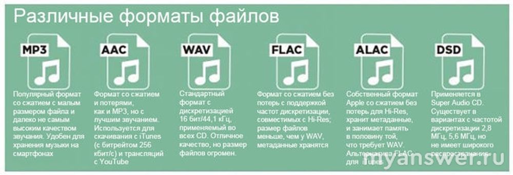 Известно, что существует множество форматов аудиофайлов, каждый из которых имеет свои особенности. Некоторые из этих форматов перечислены в приложении к данному вопросу. Рассмотрим каждый из них подробно.