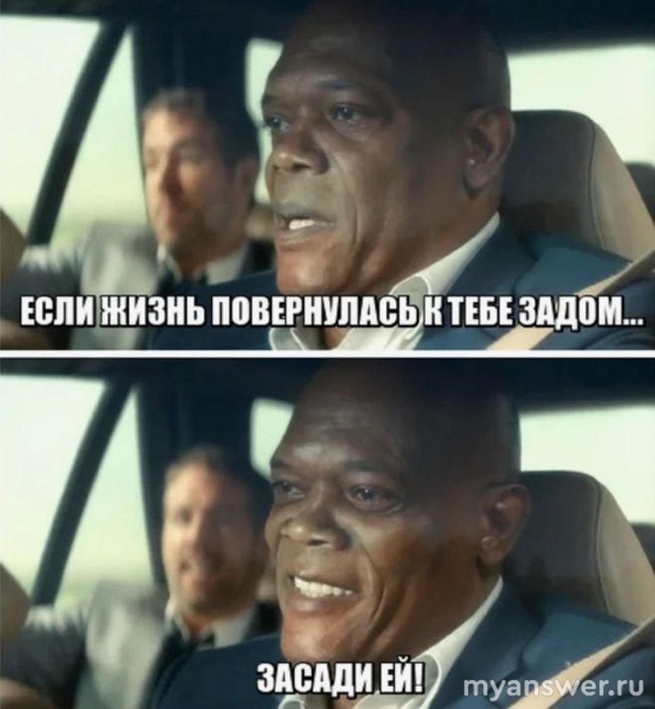 Кинкейд и Брайс в исполнении Сэмюэля Л. Джексона и Райана Рейнольдса соответственно разговаривают в машине. Киллер учит жизни телохранителя: "Если жизнь повернулась к тебе задом..."