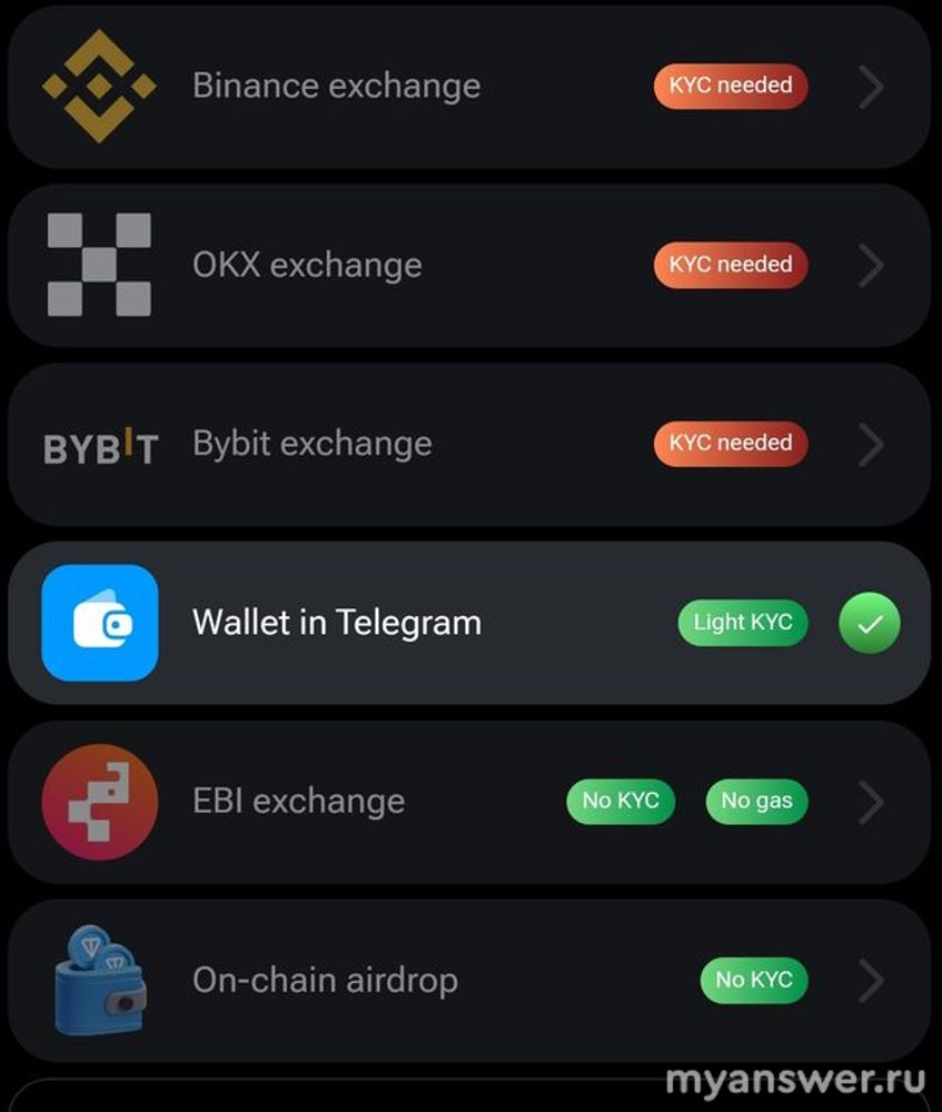 Нужно выбрать один из вариантов вывода токенов $HMSTR из Хомяка. Собственно, таких вариантов всего шесть. Это четыре крипто-биржи (Binance, OKX, ByBit, EBI), встроенный кошелёк в самом ТГ и некастодиальные кошельки (Tonkeeper, MyTonWallet, TON Space и т.д.). Вывод на крипто-биржи и встроенный кошелёк бесплатный, а вот за последний вариант придётся заплатить комиссию (вроде как не меньше 0,3 TON - порядка 150 руб., так что ну его :-))