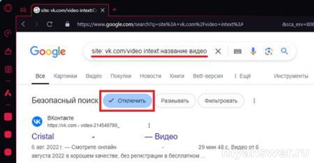 В настройках самого поиска Google, предварительно отключите безопасный поиск. Далее введите в строку поиска вот такую комбинацию site: vk.com/video intext: и далее собственно название самого искомого видео. Ну и команда Выполнить. Гугл должен показать ссылки на видео, которые во ВКонатакте были спрятаны цензурой. Ведь на серваках они остались, другое дело что Вконтакте не дает к ним путь.