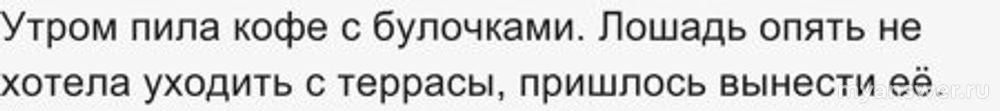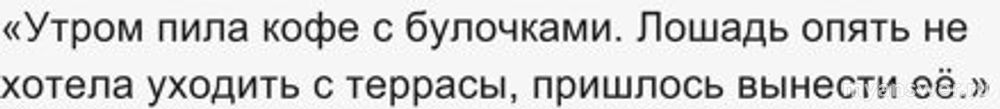 «Утром пила кофе с булочками. Лошадь опять не хотела уходить с террасы, пришлось вынести её.»