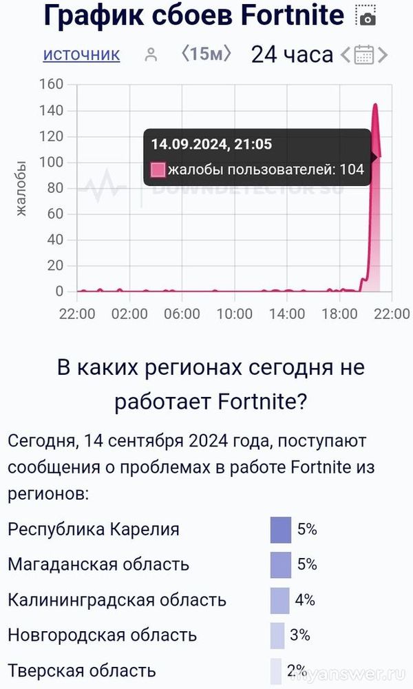 Вечером в субботу, 14 сентября 2024 года, вдруг резко засбоила компьютерная игра "Фортнайт", и еë заядлые игроки тут же стали сообщать о данном неожиданном техническом сбое. Скорее всего, возникли серьёзные технические проблемы на игровых серверах, и теперь нужно просто ждать устранения этих технических неполадок.