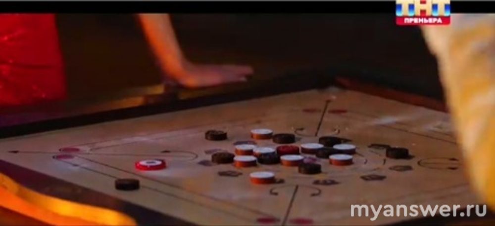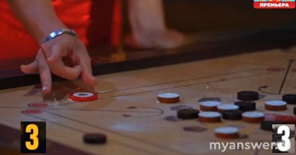 Первая игра под названием "Карром". Время, отведенное для первого задания – 15 минут. Нужно за это время успеть забить в лунки фишки своего цвета.
