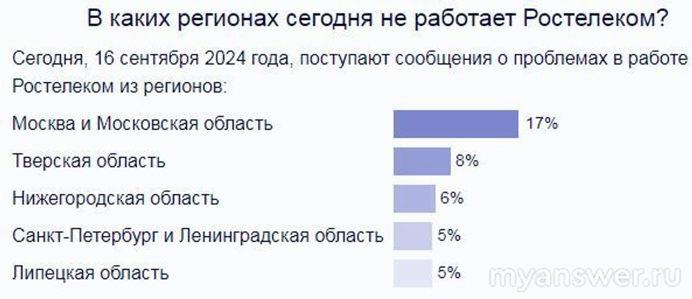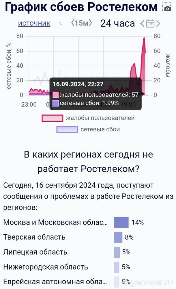 Начиная с 16 часов 16 сентября 2024 года на провайдера Ростелеком стали активно жаловаться.