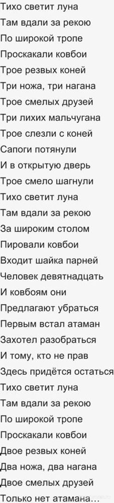 Текст сложный, с только исполнителям понятными аллегориями. Если бы, атаман был у шайки из 19 парней, то я бы понял. Но оказывается, что атаман был у ковбоев, то есть, среди трех американских пастухов, которые пасли овечек и коров, один пастух, был не просто старшим пастухом, а целым атаманом. А может он стал их атаманом, когда они в забегаловку зашли покушать.