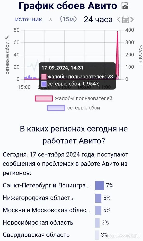 Действительно, на сайте сбоев сегодня 17 сентября показывает, что произошел в некоторых регионах сбой сайта и приложения Авито.
