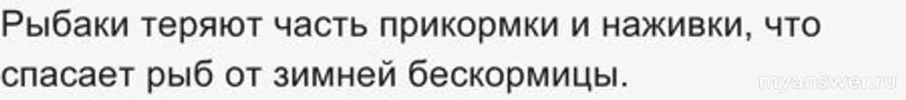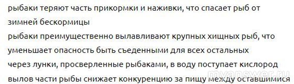 Очень такой интересный и полезный для получения знаний вопрос. Почему? А что для водных экосистем весьма значимо и при отсутствии чего они могут разрушаться? Зимняя бескормица едва ли грозит так уж массово, да и что там накидают рыбаки, ерунда это. По хищным рыбам тоже самое, если бы рыбаков не было то что - рыбу бы всю переели, что-ли? Конкуренция в части пищи тоже не то. А вот кислород, именно он столь важен, ведь лед не дает ему в воду проникать, массово может вымирать в водоемах рыба именно из-за этого. Получается, вариант предпоследний как-раз и будет для данного вопроса верным, лунки дают к воде доступ кислороду.