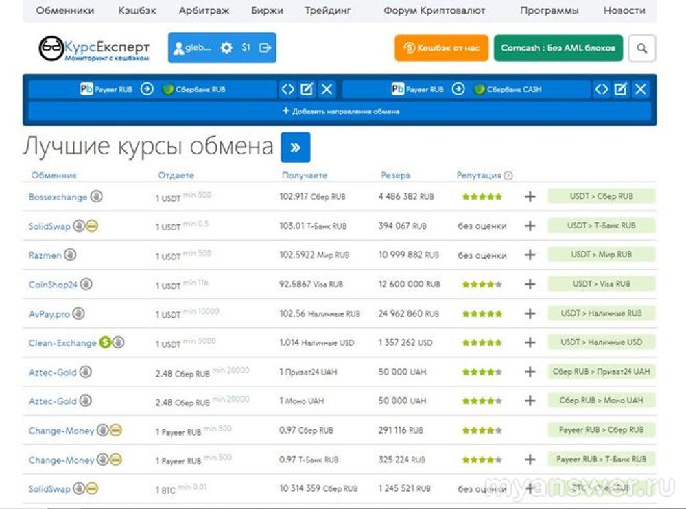Не у всех на кошельке Пайер есть сумма более 5000 рублей, вот у меня пока лишь 1200, но должно "упасть" ещё столько же. То есть напрямую с кошелька Пайер на карту Сбер вывести не получится. Есть много обменных пунктов, самый популярный в России bestchange, но там опять таки зависит от суммы перевода. Хотя можно найти вывод даже от 500 рублей. Есть ещё такой сайт как Курс Эксперт, где всё довольно понятно, нужно лишь указать направление обмена и выбрать из предложенных вариантов наиболее выгодный для себя курс. Вот как выглядит интерфейс Курс Эксперт: