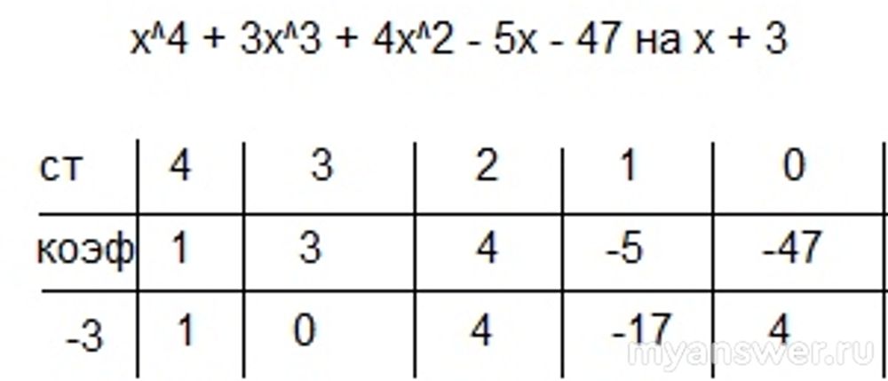 Как решить: Разделите многочлен x⁴+3x³+4x²-5x-47 на x+3 по схеме Горнера?