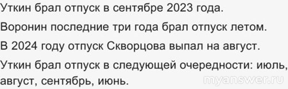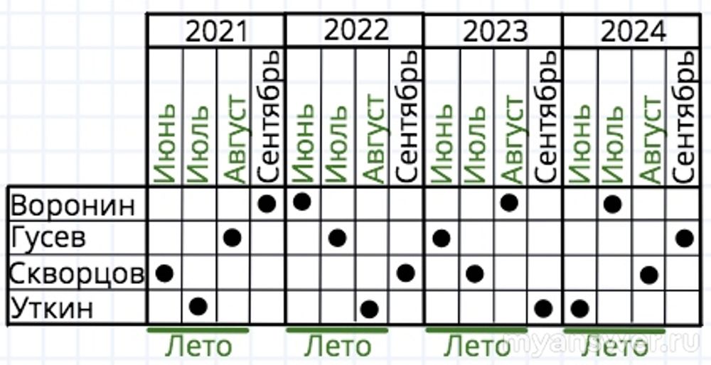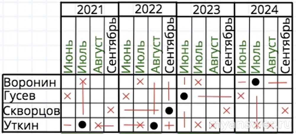 Гусев в 2023 году ходил в отпуск в июне. В 2024 он в июле не мог пойти (Воронин был), а в июне уже был. Значит, в 2024 году у него август или сентябрь. В 2022 году Скворцов брал отпуск в сентябре, значит, Гусев, в 2022 в сентябре не ходил. Тогда в 2024 году у него сентябрь, а в 2021 - остаётся август, так как июль занят Уткиным. Тогда в 2022 году - июль. Получается для Гусева:
