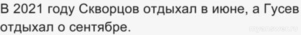 Скворцов в 2022 году пошёл в сентябре. В 2024 году уже заняты июнь Уткиным, сентябрь Гусевым и июль Ворониным. Тогда Скворцов в 2024 году ходил в отпуск в августе. Остаётся у него июнь и июль. В 2021 году июль занят Уткиным, значит, он в июле ходил в 2023 году, а в 2021 - в июне. Расклад для Скворцова:
