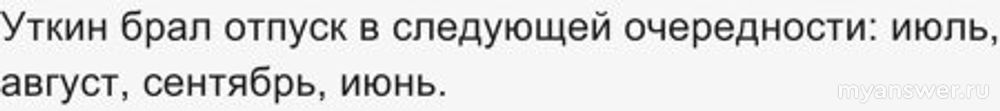 Первое и самое простое, что мы можем узнать из условия - Уткин отдыхал в июле и августе, значит, в 2023 году он мог взять отпуск либо в июне, либо в сентябре. Посмотрим, нет ли в вариантах отдыхавших в июне или сентябре 2023 года. И видим вариант на второй строчке: Уткин действительно отдыхал в сентябре этого года. Значит, утверждение на первой строчке верное. Отсюда вытекает и верное суждение о том, что Уткин брал отпуск последовательно в июле, августе, сентябре и июне. Теперь разберемся со Скворцовым. Он отдыхал в 2022-м в сентябре, а в 2023-м - в августе, поэтому вполне возможно, что в 2021-м он отдыхал в июне. А Гусев по условию в июне отдыхал в 2023-м. Теперь можно составить простую схему и определить все верные суждения. Вот они: 1,4,5,7.
