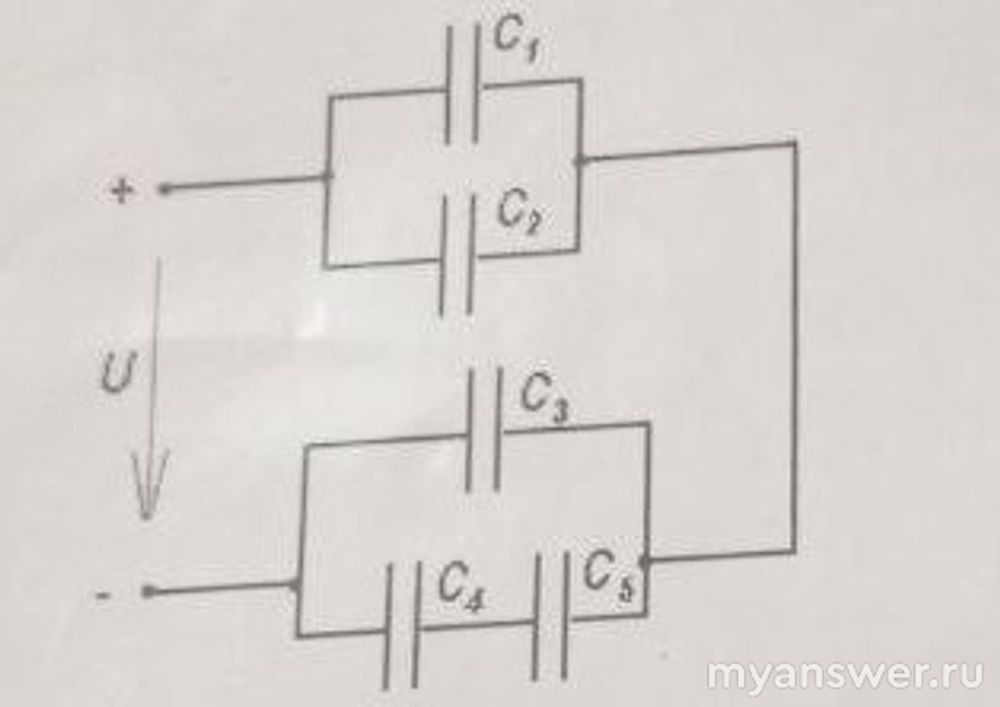 По условию С1=13 мкф, С2=1 мкф, С3=24 мкф, С4=15 мкф, С5=10 мкф. По приведенной схеме видно, что конденсаторы С1 и С2 соединены параллельно, значит их суммарная емкость равна С1+С2=13+1=14 мкф, конденсаторы С4 и С5 соединены последовательно, их суммарная емкость равна С4*С5/(С4+С5)= 15*10/25=6 мкф. С3 соединен параллельно к С4 и С5, поэтому суммарная емкость этих трех конденсаторов равна: 24+6=30 мкф. И конденсаторы 1,2 соединены параллельно к 3,4,5 поэтому эквивалентная емкость системы равна 14+30=44 мкф.