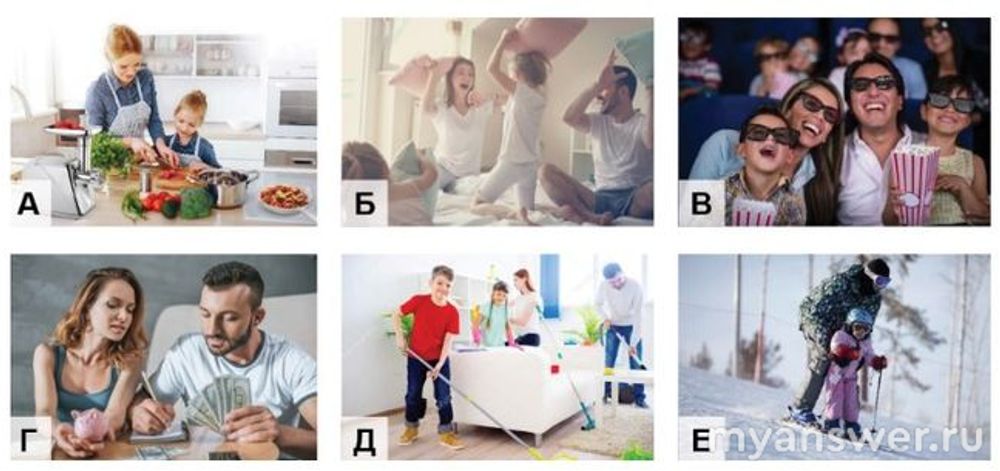 Не сложное, хотя и познавательное вышло задание, наполнение 1 группы по условию уже понятно - картинка с обозначением А (женщина и ребенок нарезают мясо, находясь на кухне), это такой вид деятельности как "Труд", именно так и назовем нашу группу. Сюда относим еще картинку с обозначением Г (семейное планирование бюджета) и картинку с обозначением Д (семейная уборка квартиры). Вторая группа, ее назовем по виду деятельности - "Развлечение" и отнесем сюда картинки (оставшиеся, поскольку, обе группы должны быть равными) с обозначениями Б (бой на подушках), В (семья в кинотеатре) и Е (катание на лыжах).