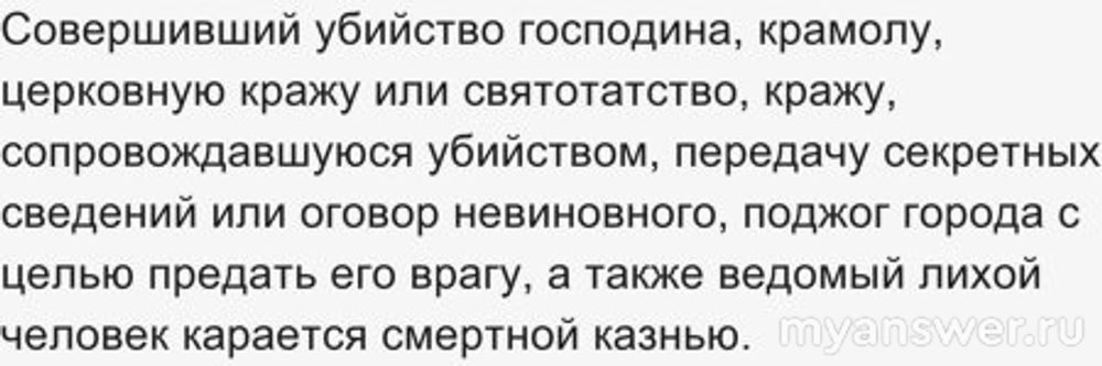 Совершивший убийство господина, крамолу, церковную кражу или святотатство, кражу, сопровождавшуюся убийством, передачу секретных сведений или оговор невиновного, поджог города с целью предать его врагу, а также ведомый лихой человек карается смертной казнью.