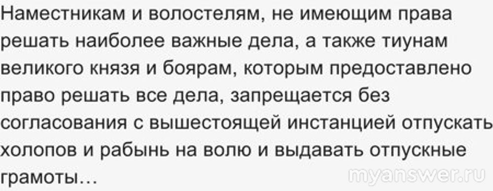 Наместникам и волостелям, не имеющим права решать наиболее важные дела, а также тиунам великого князя и боярам, которым предоставлено право решать все дела, запрещается без согласования с вышестоящей инстанцией отпускать холопов и рабынь на волю и выдавать отпускные грамоты…