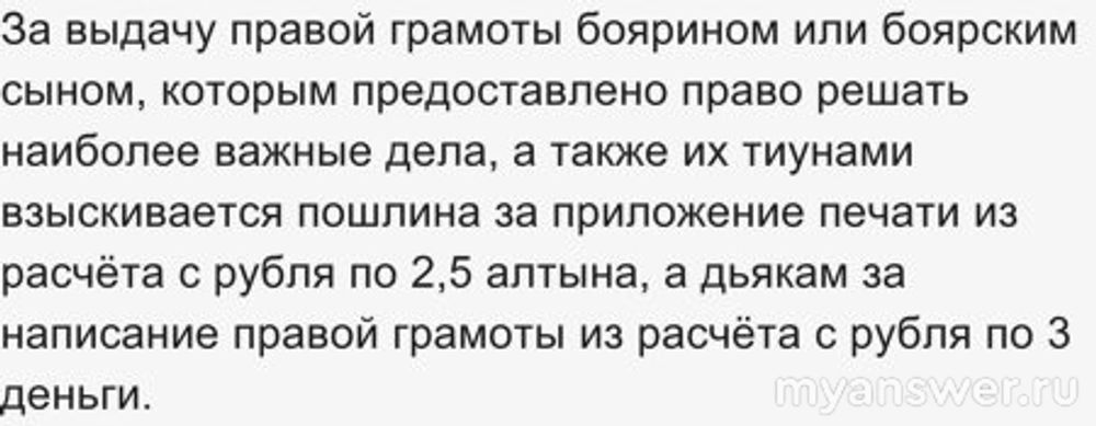 За выдачу правой грамоты боярином или боярским сыном, которым предоставлено право решать наиболее важные дела, а также их тиунами взыскивается пошлина за приложение печати из расчёта с рубля по 2,5 алтына, а дьякам за написание правой грамоты из расчёта с рубля по 3 деньги.