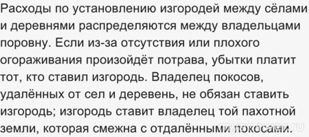 Расходы по установлению изгородей между сёлами и деревнями распределяются между владельцами поровну. Если из-за отсутствия или плохого огораживания произойдёт потрава, убытки платит тот, кто ставил изгородь. Владелец покосов, удалённых от сел и деревень, не обязан ставить изгородь; изгородь ставит владелец той пахотной земли, которая смежна с отдалёнными покосами.