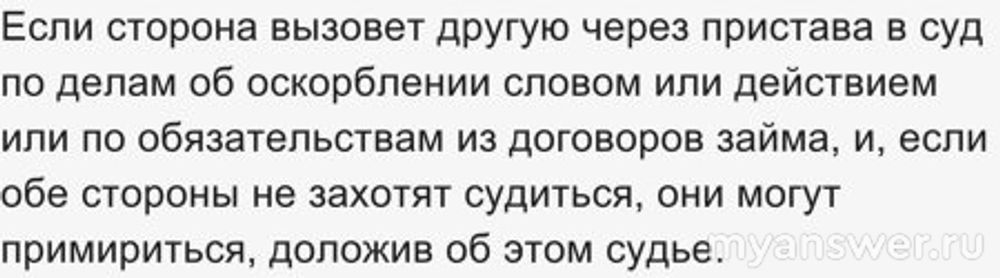 Если сторона вызовет другую через пристава в суд по делам об оскорблении словом или действием или по обязательствам из договоров займа, и, если обе стороны не захотят судиться, они могут примириться, доложив об этом судье.