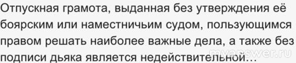 Отпускная грамота, выданная без утверждения её боярским или наместничьим судом, пользующимся правом решать наиболее важные дела, а также без подписи дьяка является недействительной…