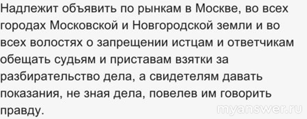 Надлежит объявить по рынкам в Москве, во всех городах Московской и Новгородской земли и во всех волостях о запрещении истцам и ответчикам обещать судьям и приставам взятки за разбирательство дела, а свидетелям давать показания, не зная дела, повелев им говорить правду.