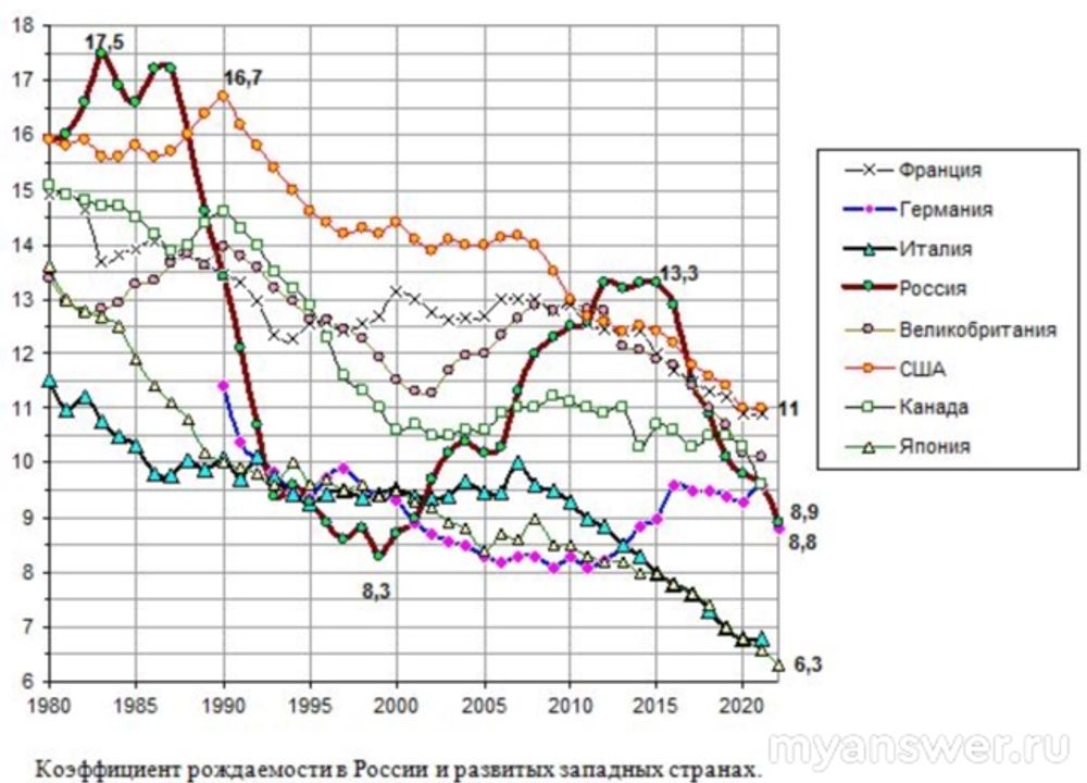 Поддержу Грустного Роджера, только цифры не знаю, а просто вспомни свои школьные годы как раз в восьмидесятые, и в моём поколении в семьях было в городе всего по одному-двум детям, а трое детей уже была редкость и семья считалась по крайней мере в этом многодетной. Как обстоят дела в сельской местности в те годы, я толком не знаю, Но то что я знаю, подсказывает, что и в деревне больше трёх детей было редкость, а это по сравнению с любыми традиционными обществами, включая Россию крестьянскую до революции никак не может считаться высокой рождаемостью. Согласен, что можно было дождаться своей очереди на квартиру бесплатно или вложиться в кооператив, практически аналог ипотеки, но когда детей было действительно много в каждой семье, Это не потому, что в деревне много места, так как избы и хаты всегда были не очень большими, и они могли даже не делиться на комнаты, Да и в царских дворцах очень много проходных комнат, которые не предполагают уединение. Просто до революции в крестьянской среде семьи нуждались в рабочих руках и религия не велела предохраняться, чтобы детей родилось столько, сколько Бог даст. А с улучшением условий жизни и развития образования продолжительность и ресурсоёмкость детства каждого ребёнка непрерывно росла продолжает расти, как и выживаемость детей даже при небольшой рождаемости из-за развития медицинской науки и повышения доступности медицинской помощи. Какие женские консультации на революции? Может быть только для царской семьи. И люди вместо надежды на Бога стали сами рассчитывать свои ресурсы. Попадалась информация про первый и второй демографические переходы. А в восьмидесятые годы некоторые относительно многодетные семьи в городах были социально не очень благополучными, потому что кто-то из родителей пил. В сельской местности вполне могло быть иначе. Ещё раз скажу, что по меркам любого традиционного общества двое или трое детей в семье не являются многодетностью.